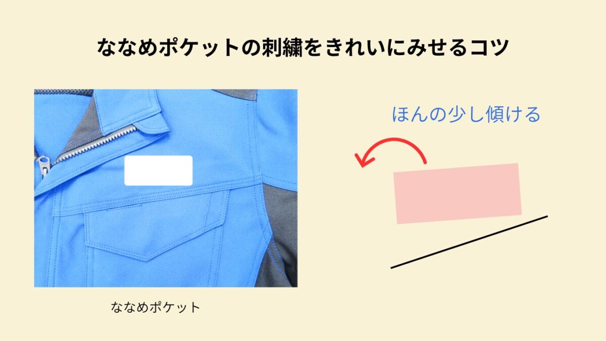 おそらく施工者は、指示書通りに「地面と平行」にきっちり刺繍を入れたのでしょう。真面目なお仕事です。ただ実際には、服を着た状態で見ると左が下がって右が上がって見えてしまう。これは刺繍あるあるのひとつです。