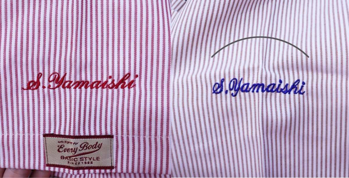 文字数が多くなると、弧を描いたように歪んでいる刺繍を街中で見かけることがあります。