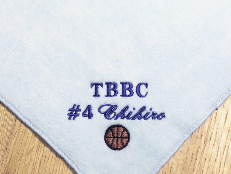 バスケチームの卒団記念として制作した、ハンドタオルへの名入れ刺繍の実績です。チーム名「TBBC」と背番号、ファーストネームを組み合わせ、中央下にバスケットボールのモチーフを配置しています。 シンプルながらも記念品としての […]