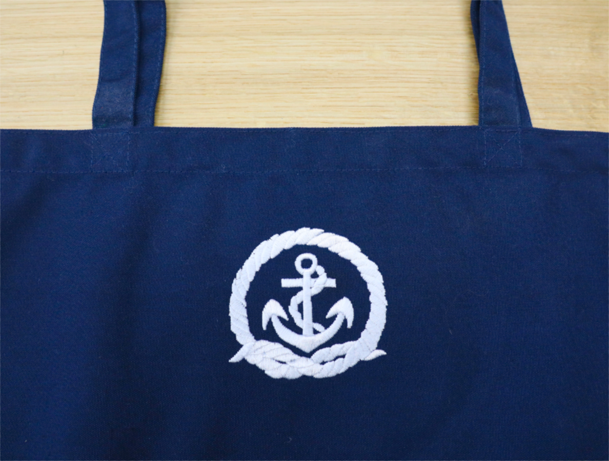 ネイビーのエコバッグに、錨(いかり)モチーフのロゴ刺繍を施しました。