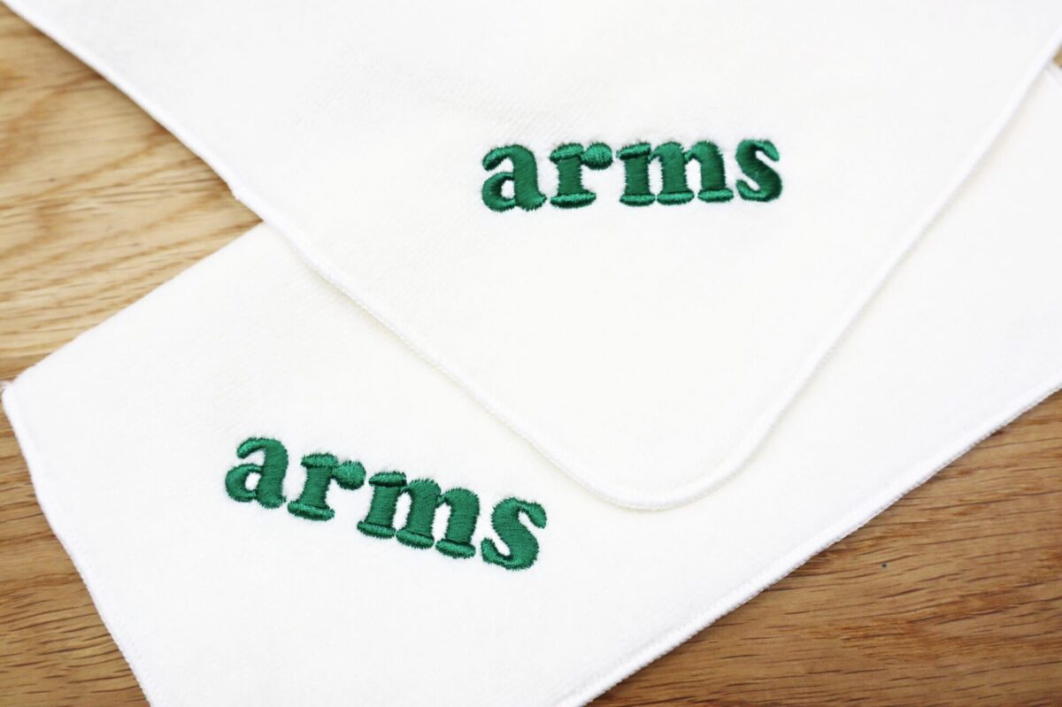白のハンドタオルにチーム名の「arms」の刺繍を施しました。