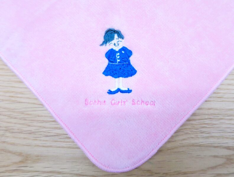 濃紺の生地に、白糸で丁寧に校章を刺繍することで、